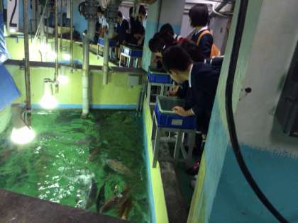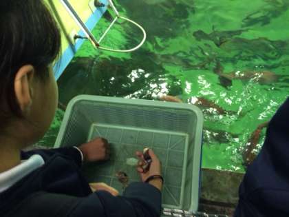 水族館の魚に餌を与えるのは、なかなか体験できないことですが、見学通路から外れて、水槽の上から、餌を与えています。