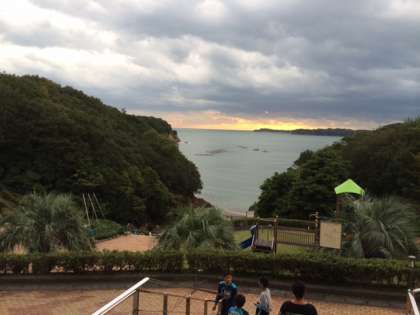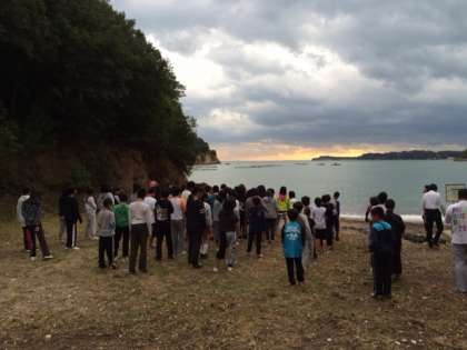 朝からホテル周辺を散策しました。ホテルのプライベートビーチを歩きながら、志摩のリアス式海岸の美しさを堪能しました。水平線の向うに朝日が微妙に見え隠れしていました。さあ、修学旅行2日目の始まりです。