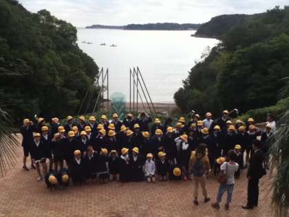 ホテル側から志摩の海をバックに学年全員で記念写真を撮ります。
