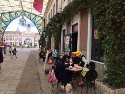 このグループは、オープンカフェのようなお店で、何かを食べているようです。