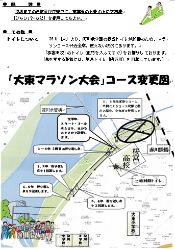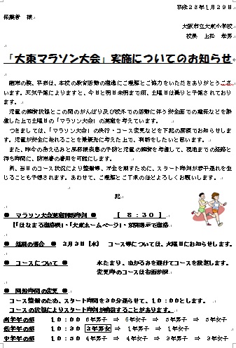 本日、『「大東マラソン大会」実施についてのお知らせ』を配付しておりますので、よくお読みいただき、明日の子どもたちのがんばりに、たくさんの応援をよろしくお願いします。