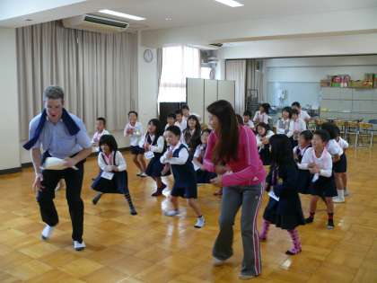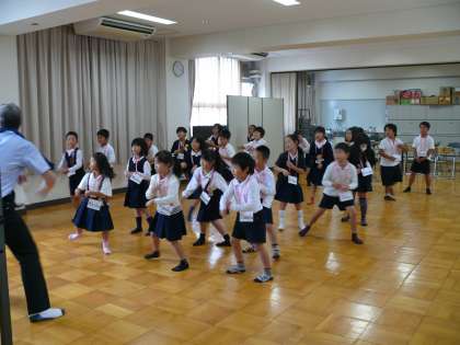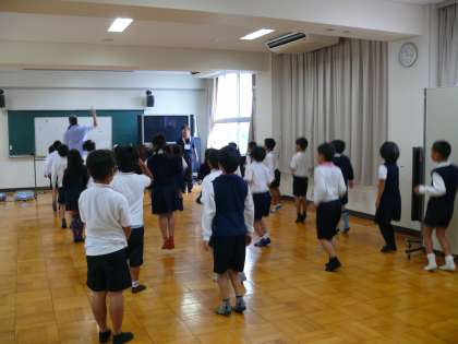 英語での歌やダンス、スタンツなどを楽しみながら英語(発音)に親しみました。「アップ」「ダウン」「ライト」「レフト」などの講師の先生の英語での指示に合わせて、動作をつけていました。