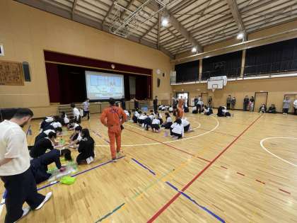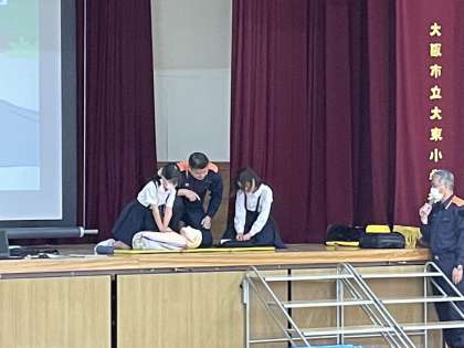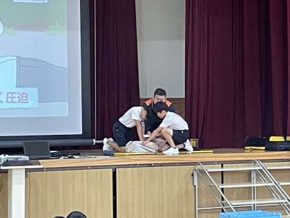 6年生は、心肺蘇生法を消防隊の方たちから動画を見せてもらったり、人形を使ったりしながら学びました。