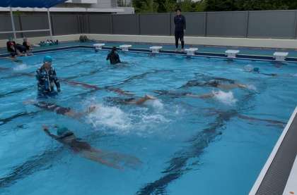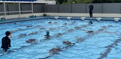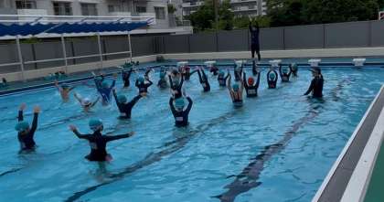 プールの中で、音楽のリズムに合わせておどったり、だるま浮きやけのびをしたりしました。