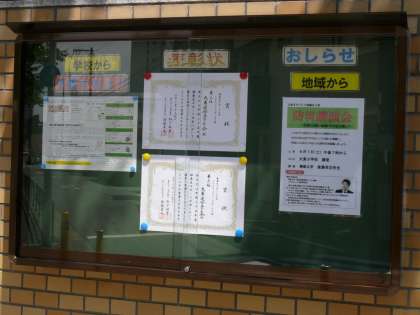昨日、正門横に掲示板を設置しました。この掲示板は、大東友の会から寄贈されたものです。(友の会の皆様、本当にありがとうございます。)さっそく、大東小だより、都島区スポーツ大会の表彰状(キックベースボール・ソフトボール)などを掲示しました。学校の前を通られたとき、一度ご覧になってください。
