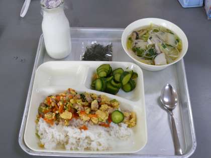「豚たまごご飯」「にゅうめん」「きゅうりのピリ辛あえ」です。大阪市の児童が考えた献立の中から受賞したものです。