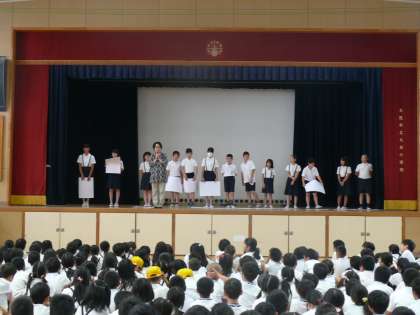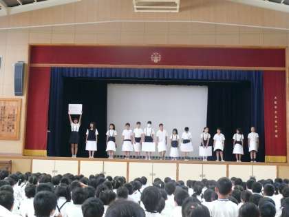 図書委員会の発表は、図書室の使い方についてのクイズでした。そのあと、来週月曜日から始まる読書週間のお知らせもありました。はっきりとわかりやすく、そして大きな声で発表している姿が印象に残りました。
