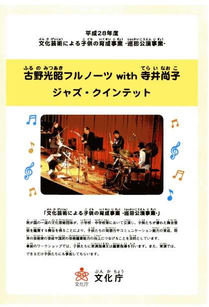 明日7日(火)13:30より、文化庁「文化芸術による子供の育成事業」の巡回公演で古野光昭(ふるのみつあき)フルノーツwith寺井尚子(てらいなおこ)ジャズ・クインテットのみなさんの演奏を鑑賞します。体験型の公演なので児童も一緒に参加するプログラムもあります。プログラムの詳細は