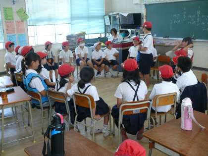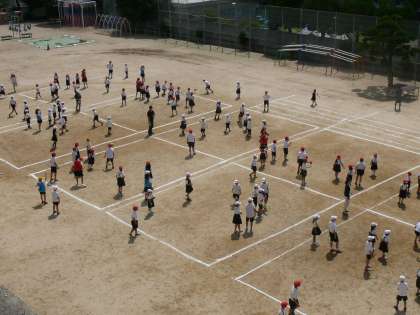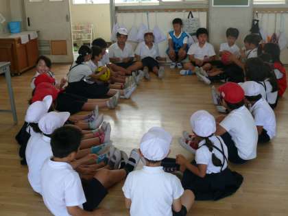 戻ってきました。まずはお茶をゴックンです。予想通り、笑顔笑顔笑顔でした。教室での遊び、運動場でのドッジボール、どの班も協力して出来ていました。低学年の楽しそうな姿を見て、自分も楽しいと感じる。それがたてわり班活動のねらいの一つです。これからは、児童集会も基本的にはたてわりの形で進められます。2学期には大東まつりも・・・。6年生頼りにしていますよ。