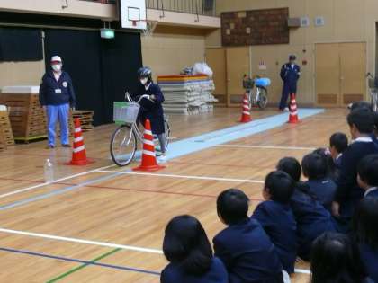3、5年生は、安全な自転車の乗り方を実際に体験することと、夜の自転車がどんな風に見えているのかなどの実験をしながら説明と指導をいただきました。