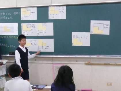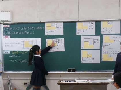 エル型の面積の求め方を切ったり、貼ったり、区切ったり、2こを合わせたりしながら自分の考えを発表して、様々な意見を聞くことで、考え方を広げたり、よりよい方法に気づく学習・授業を展開して、討議会で議論しました。