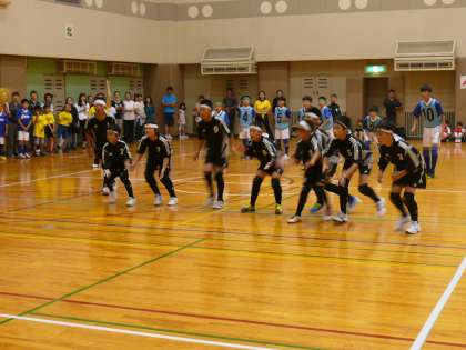 男子は、予選リーグを無敗で勝ち進み、決勝戦へコマを進めました。決勝戦では、余裕で、優勝かと思われましたが、まさかの前半戦、3人差でセットを落としてしまいました。優勝をするには後半、4人以上の差をつけて勝たねばなりません。試合も終盤になり、劣勢のままの状態で、ここまでかと思われたところから、怒涛の反撃が始まりました。残り1分を切ったと思われる頃から、猛チャージで、試合終了のフエがなった時には、見事4人以上の差がついていて、優勝を勝ち取ったのでした。大歓声の中での見事な逆転ゲームでした。
