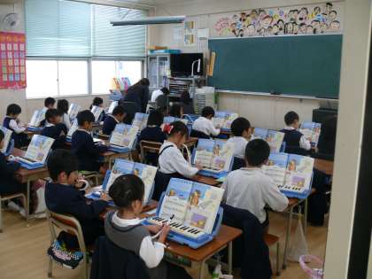 1−1 音楽 歌詞を大切にして歌いましょう。「はる、なつ、あき、ふゆ」の合唱。「きらきら星」のピアニカでの演奏を披露しました。とても元気いっぱいの音楽学習でみんなのりのりでした。