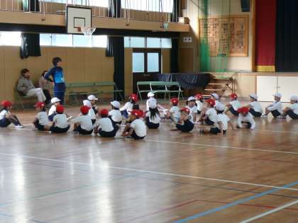 1−2 体育 講堂でさまざまな運動をしました。楽しみながら遊びながら、たくさん体を動かします。遊びの動きの中で、ルールを作り、自分で理解しながら、ルールを守る学習をしました。