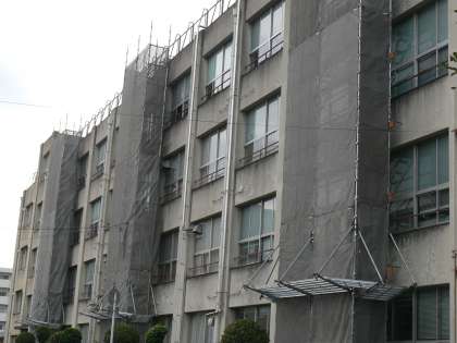 この夏休みに、待ちに待った「冷房施設」がようやく設置される予定です。その工事がいよいよ始まりました。校舎の道路側にそびえ立つ3本の足組。ちょっとじゃまに見えるけれども、これこそが、屋上の室外機と教室の冷房機をつなぐ配管の設置場所になります。しばらく、この状況は続きますが、9月には、冷房完備の状態で、残暑を過ごすことができるはずです。しばらくのご辛抱を!