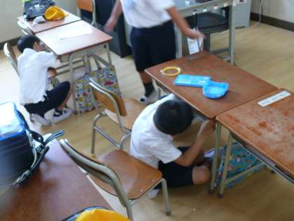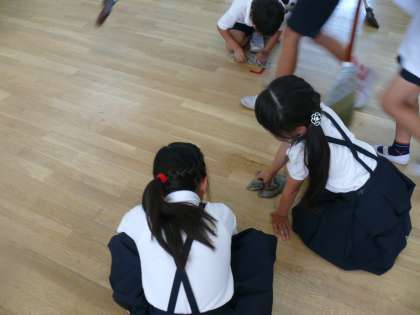 新しい学年で迎えた1学期のまとめとして、教室をきれいにする。床をピカピカに磨いていました。教室の整備をする。机の中を全部出して、拭き掃除をしていました。クラスで学期のまとめとして楽しく終えていく。5年生は、わくわくどきどきの林間に向けて、グループでの打ち合わせや全体での確認など、それぞれの1学期の終わり方を工夫して実施しています。