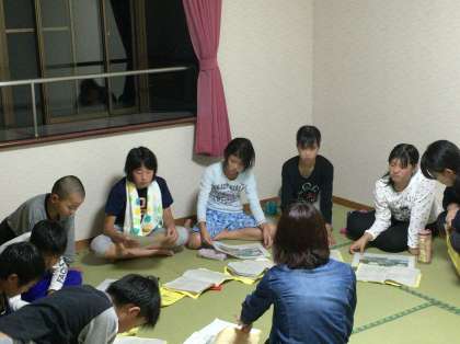 すべての活動を終え、就寝の準備をしているあいだ生活班、活動班のリーダーが反省会を開きました。今日一日の活動の様子をふり返って、反省するところや明日の予定を確認していました。