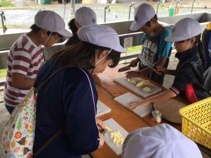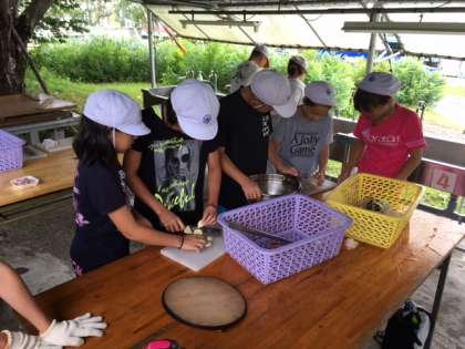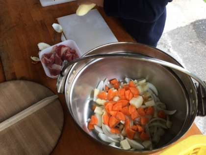 火おこしに苦労している間に、野菜を洗い、火の通りやすいサイズで、大きさもそろえながら、調理をしています。火の通り具合や、調理のスピードは、食材の大きさがあとあと響いてきます。うまく、切っているようですが・・・。