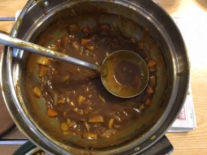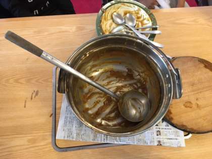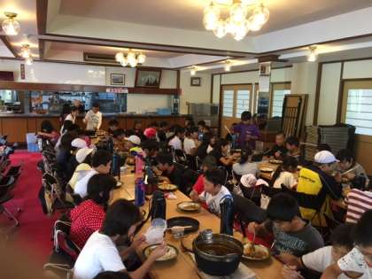小雨がふっていたので、ゆっくりと食堂で食べることにしました。鍋を持って、食堂に行き、新聞紙を敷いて、どんどん食べ進んでいきます。どのグループも完食でした。なべ底までさらって完璧に食べました。「おいしー」「最高」などなど感想やリアクションの中、満足そうに食べていました。
