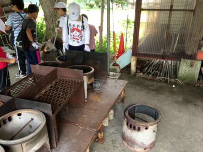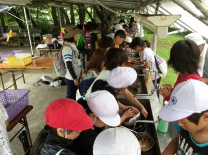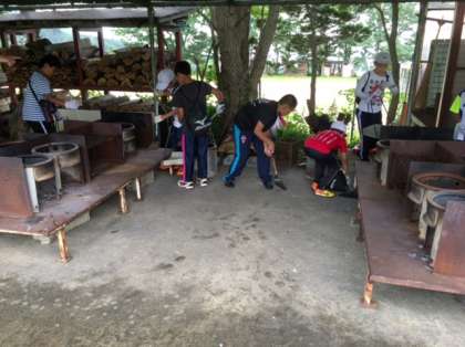 楽しく、おもしろく、おいしい、カレー作りも食事も終わり、いよいよ、林間ならではの試練です。ここが、グループの力の見せ所。かまどや鍋、食器、調理器具など、次の人たちのためにとことんきれいにします。「来た時よりもきれいに!」を目指します。鍋の裏のすすなども一生懸命に磨きます。かまども灰などきれいに掃除。次の人が気持ちよく使えるようにです。