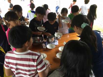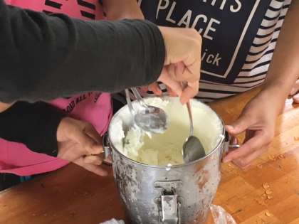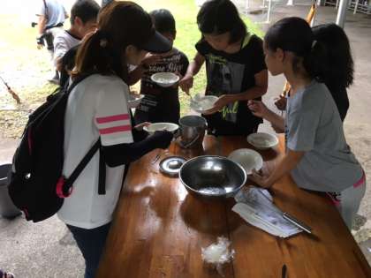 ひたすら回転させること、数十分、完成です。大成功です。冷たーい、手作りの汗のにじんだおいしそうなアイスクリームです。グループで、大事に分け合っていただきました。おいしくいただきました。