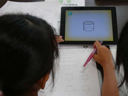 今週の5日間、実施している「都島区のやる気アップ学習」で、タブレットを活用していました。特に、算数の時間の図形の学習です。学習会に参加している児童が自分の課題プリントを解いていく過程で、わかりにくいところ、納得しにくいところに出会うと、タブレットが登場します。その問題にマッチしたヒントなどが表示され、児童はヒントをもらって、自力解決を図っていました。