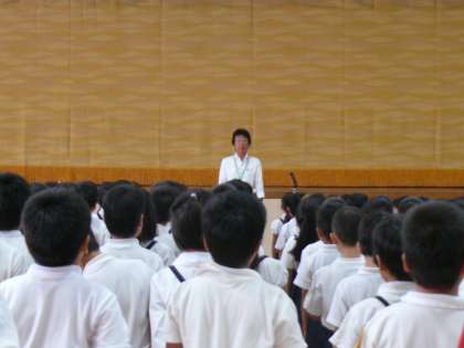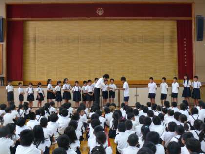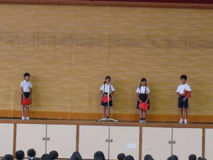 その後、4年生の子たちが、2学期頑張ること! について話をしてくれました。「運動会のリレーがんばるぞ」「作品展も!」「苦手な教科を克服するぞ」「読書ノートも!」「家の手伝いも進んで・・・」などなどしっかりと発表していました。(4人の子どもたち、緊張したかもしれないけれど、いい経験になったはずです)
