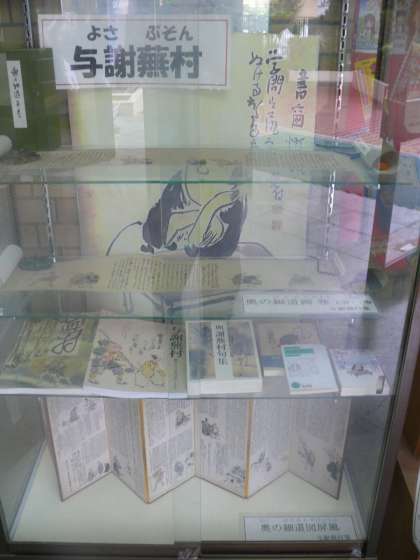 手始めに、玄関に蕪村の紹介コーナーを設置しました。蕪村が、「画人」として書いた「奥の細道画巻」のレプリカや「奥の細道屏風」のミニチュアを展示しています。蕪村に興味を持ってもらおうと作りました。