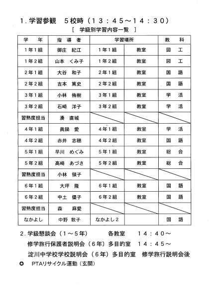 学習参観のあとには、1〜5学年は懇談会、6学年は修学旅行の保護者説明会と淀川中学校の学校説明会を行います。