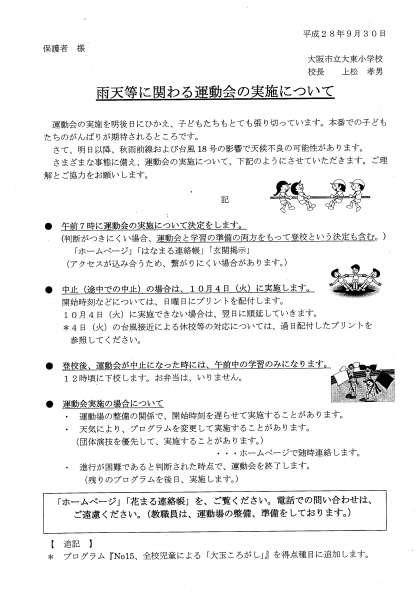 本日配布しました「雨天等に関わる運動会の実施について」のプリントをこちらにもアップしました。