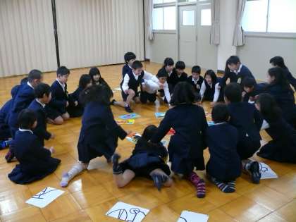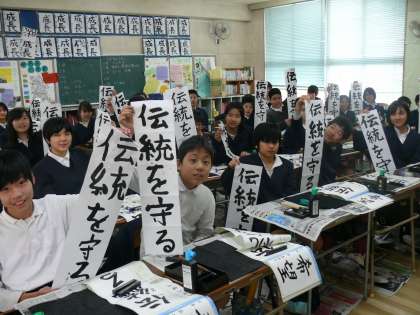 2年生は、ジャンボかるた大会。6年生は、書初め「伝統を守る」を書き、雲花紙に貼って掲示します。