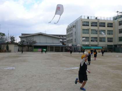 1年生は生活科「昔遊びをしよう」と図工科で作った凧を5時間目に運動場でお正月遊びの凧上げをしました。