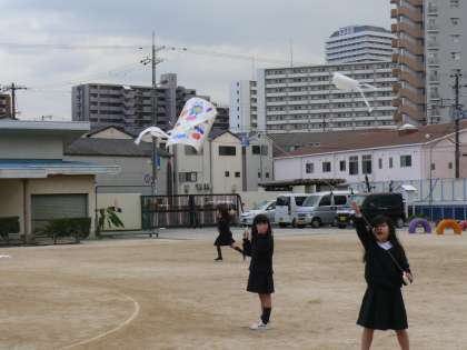 昔からの遊びを、体をおもいっきり使って楽しむことは、生活科の大切なねらいです。友だちの凧と絡まないようにコントロールをしようとしてみたり、上げ初めは短くした方が上がりやすいなど、体を動かしながら凧を上手にあげるコツをそれぞれが発見し、工夫していました。友だちと高く上げれるか競い合ったり、広い運動場をめいっぱい走りまわり全力で楽しんでいました。