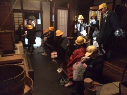 最初に、むかしのくらしを学習する体験学習で、アイロンや筆箱、蓄音機、器など昔使っていた道具を見せてもらいました。また、クラスから一人女の子は着物!男の子は半纏を着させてもらうなど、クイズや実験をしながら楽しく学ぶことができました。