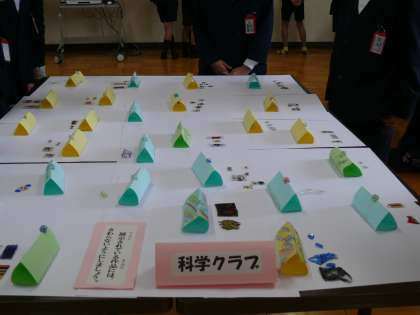 科学クラブは、ガラス玉を鍋で加熱し、中に切れ目が入ったものと、廃棄物となるプラスチック容器などを利用して作ったプラ板を展示していました。