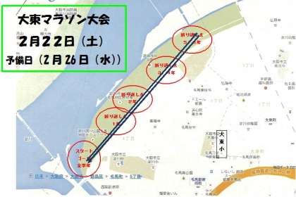 体づくりをめあてとした「耐寒かけ足」を実施しています。その集大成として、「大東マラソン大会」を予定しています。「大東マラソン大会」も今年度から新たに実施する学校行事です。日頃は、運動場を走っていますが、「大東マラソン大会」では、淀川の河川敷を走ります。子どもたちへの応援、激励ととともにコースの沿道に立っていただき、安全面でもご協力いただけたら、子どもたちはより安心して力を出せると思います。多数の方々の参観をお待ちしています。
