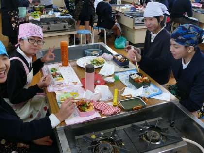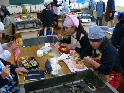 今回は、お弁当作りをしました。中学校に進学するにあたって、2学期に「お弁当つつみ」をミシンで縫いました。今回は、お弁当の調理実習という一連のカリキュラムです。