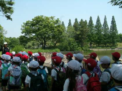 晴れわたる青空のもと、1年生が小学校に入学して初めての遠足に行きました。城北公園を目指し、淀川のながいなが—い堤防を歩きました。歩いている途中、日吉神社や淀川ワンド、千人塚を見て学びました。