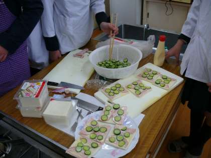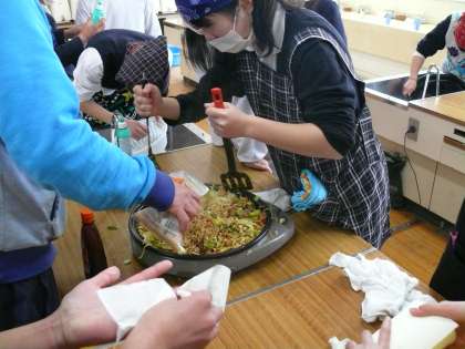メニューは、「やきそば」「サンドイッチ」「白玉入りフルーツポンチ」です。心を込めて、学年全員で作りました。