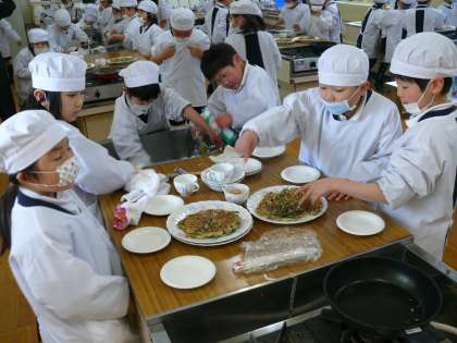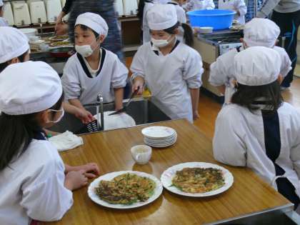 1年生が、調理実習(?)もどきをして、日本以外の国の食べ物に親しむ活動をしました。1年生は、学習発表会で「世界の国々の紹介」、異文化交流、そして、今回の「食」を通して(韓国・朝鮮のチヂミ)、他の国の文化に親しむ活動をしました。
