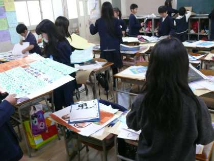 作品やプリント、日直の名札・掃除当番・給食当番の名札まで、この1年間のがんばりの証。作品袋に自分で思い思いの絵を書いて、大切に持って帰ろう。