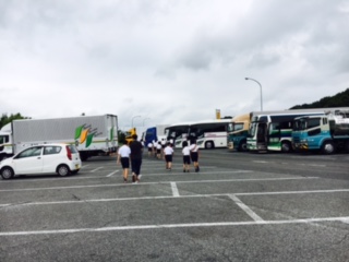 9時赤松パーキングエリアに、到着。順調に1つ目の休憩所に到着しました。バスの中では、バスレク係を中心に大いに盛り上がっています。雨が心配された出発しきでしたが、今のところは大丈夫そうです。