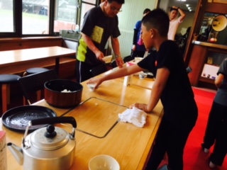 朝早くから活動した一日。おなかもペコペコにすいていることでしょう。家ならば、「おなかすいたー。」と言えば、すぐに出てくる食事も、林間学習では、自分たちで準備あとかたずけをしなければいけません。食事係さんが責任を持って準備しています。