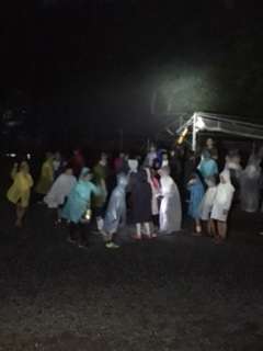 夕方から降り始めた雨。どうやら、キャンプファイアーはできそうにありません。ということで、二日目に予定していたナイトハイキングをしました。真っ暗な道をお札を求めてハイキングします。お札はみつかったのでしょうか?