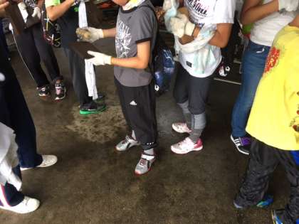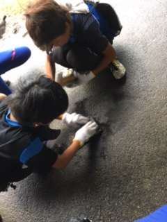 林間学習の楽しかった思い出に焼き板を作ります。まずは、説明をききました。真っ黒に焼けた板を家から持ってきたタオルでひたすら磨きます。初めは真っ黒だった木がこするほどにつやがでてきます。林間の楽しかった一コマをアルスカラーの塗料を使って描きます。どんな作品になるか、楽しみにしていてくださいね。