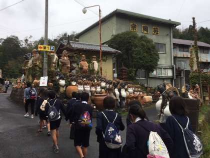 9時30分過ぎ、予定通りに一つ目の活動である、宗陶苑到着しました。ここでは、信楽焼の体験をします。たくさんのたぬきの置物に出迎えられいよいよ始まります。