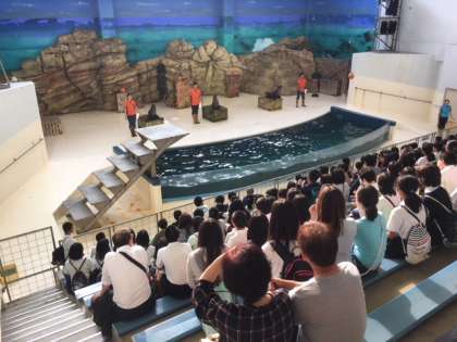 15時30分からアシカショーがありました。ハロウィンバージョンで、ノリノリの音楽に合わせて、ボールを鼻の上にのせたまま身体を回転させたり、ダンスを踊ったり、輪投げをしたりと、トレーナーさんとの息のあったショーにみんな大盛り上がりでした。