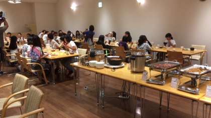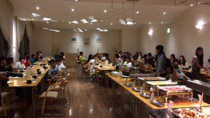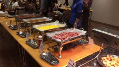 お待ちかねの夕食の時間がやってきました。バイキング形式で好きなものを好きなだけ取って食べることができます。真ん中のテーブルに並んだごちそう。目をキラキラさせながら、楽しそうに選び、笑顔いっぱいで食事をしています。