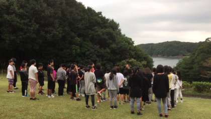 夜はしっかり眠ることができたのでしょうか?体調を崩すことなく全員元気に朝の会に集合しました。心配されたお天気も今のところは大丈夫そうです。海をバックにしっかり体操をし、今日も一日がんばります。