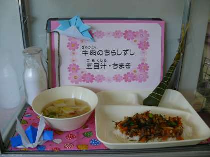 今日の給食は、「子どもの日」の行事献立でした。メニューは、「牛肉のちらしずし・五目汁・ちまき」でした。